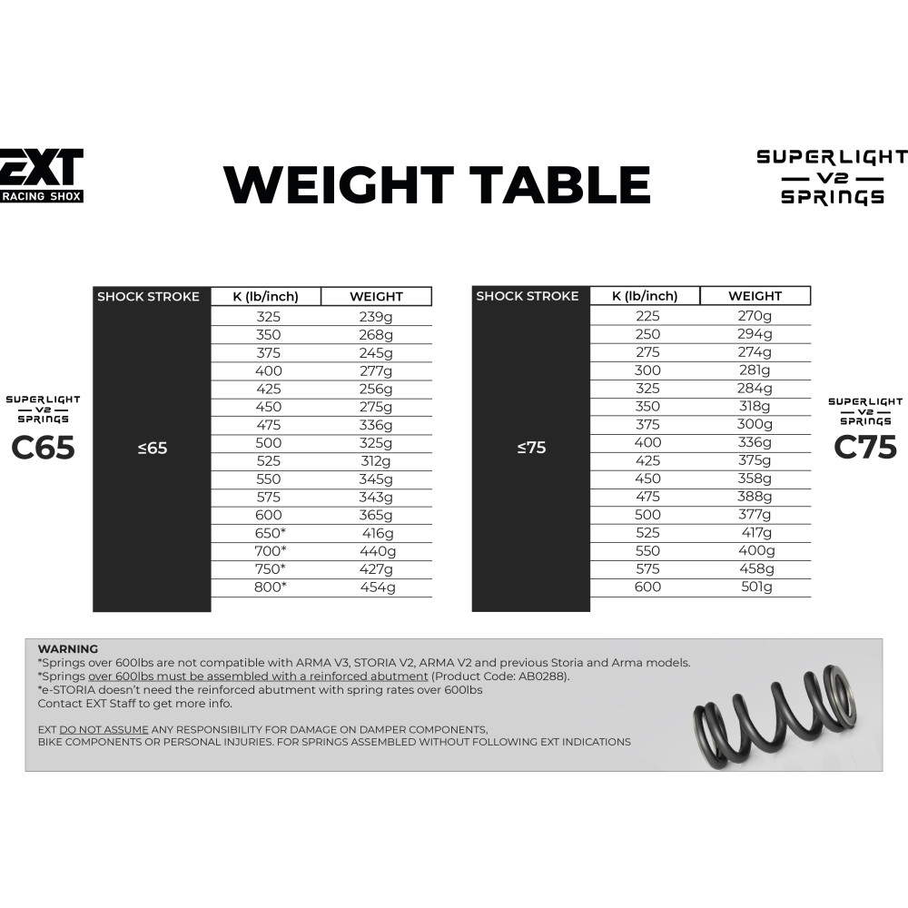 The new EXT Superlight V2 springs are developed using exotic materials used mainly in motorsport. This material is characterized by very high tensile strength and, combined with a specialized design and specific manufacturing methods and processes, a new generation of springs is achieved that weigh up to 30% less than "normal" steel springs or previous EXT springs.