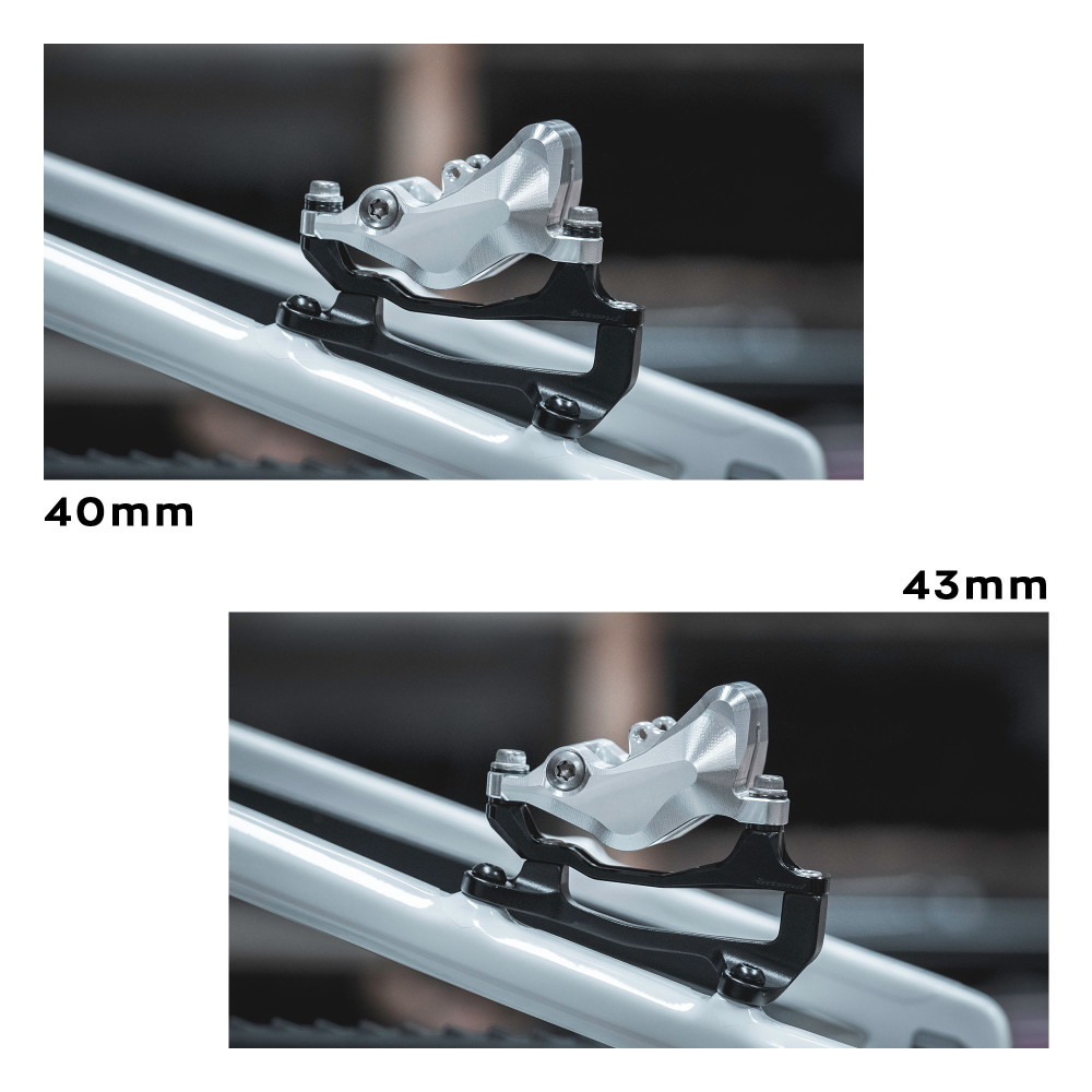 Prémiový nízkoprofilový 4-skrutkový adaptér 2v1 (40/43mm) s potenciálom redukcie vibrácií medzi strmeňom a kotúčom