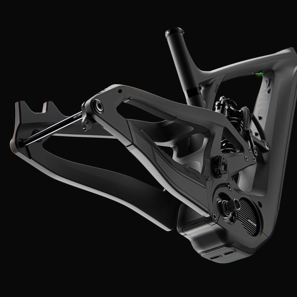 A pair of sturdy carbon triangles surrounds the EP8 powerhouse, protected from front tire projectiles by a custom skid plate beneath the motor and a shuttle shield under the downtube. As ever, chain slap is silenced by a hefty sound mound strip on the chain stay, and there's a second slab of "shut-up" inside the seat stay.