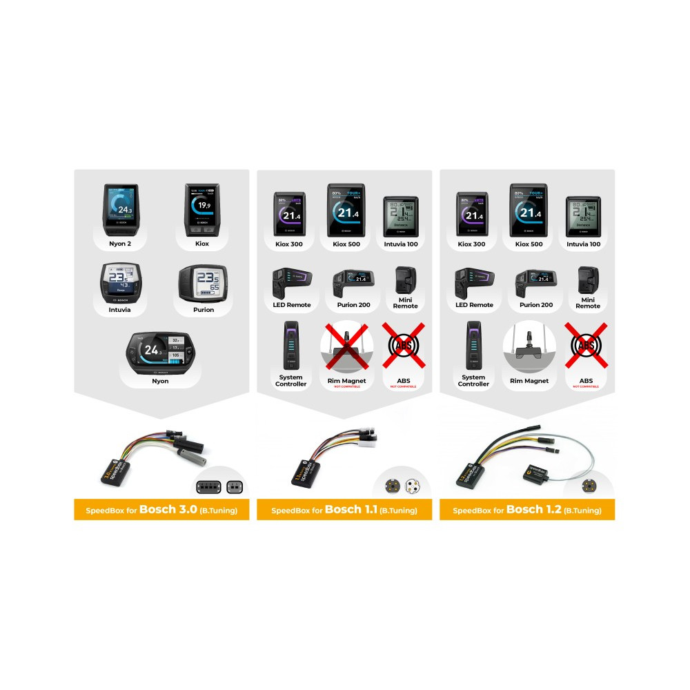 Podporuje všetky generácie gen2/3/4/ Active Line, Performance Line, Performance CX od 2014-2022 i najnovší Bosch firmware z 2022, displeje Purion / Intuvia / Kiox / NYON / NYON 2021 ( nekompatibilné s BOSCH SMART SYSTEM BES3 2022/23)