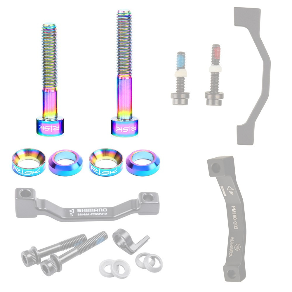 RISK Oil Slick SET Titánových skrutiek s plávajúcimi podložkami do 2-skrutkového adaptéra s priamym uchytením strmeňa do rámu alebo vidlice (napr.: adaptéry so +20/23mm zdvihom Magura QM40/QM44, Shimano SM-MA-F203P/PM, a iné )