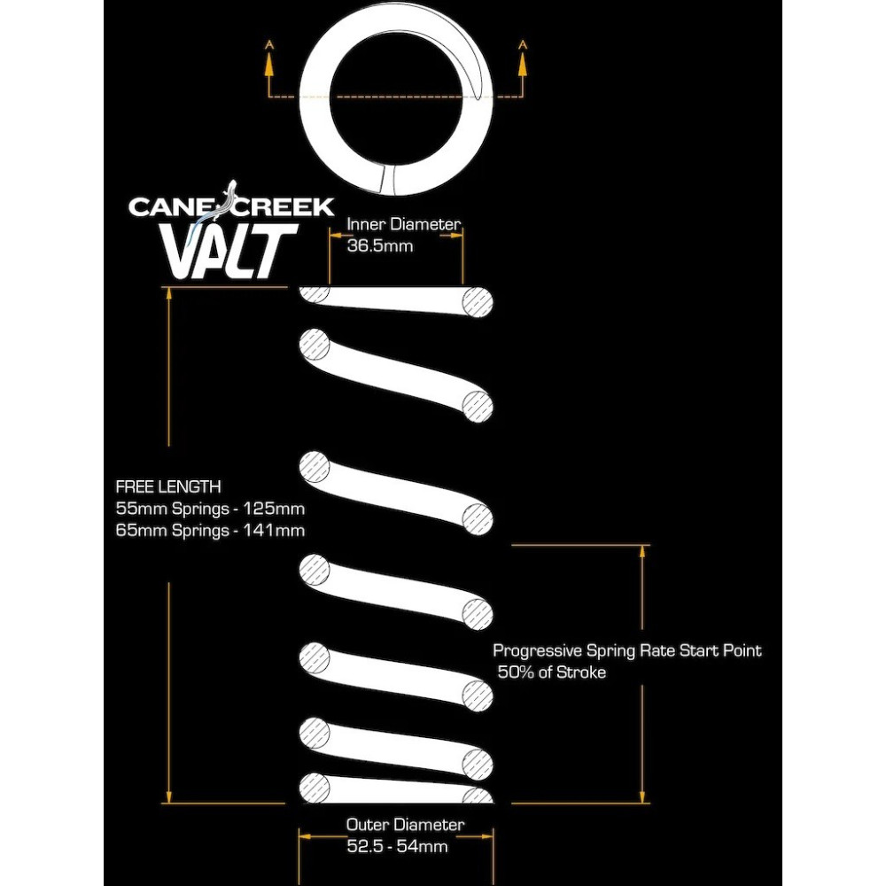 Pružiny Cane Creek VALT PROGRESSIVE umožňujú ďalší level nastavenia vášho odpruženia. Vďaka progresívnemu chodu môžete docieliť neuveriteľnú citlivosť v začiatku chodu odpruženia, bez toho aby ste v jeho konci narážali do dorazov. Vyvinutá v dielňach Cane Creek Cycling Components.