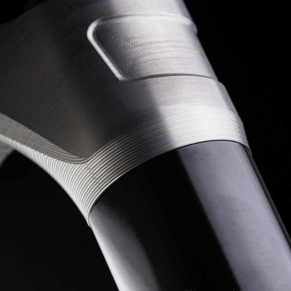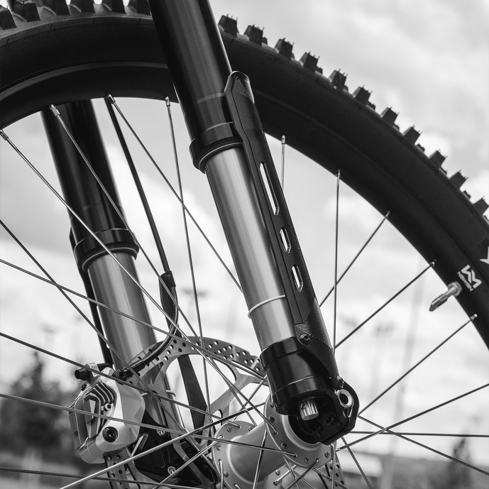 38 mm stĺpiky žiaria v pôvodnej tvrdo eloxovanej farbe, pokryté čiernymi, CNC obrábanými spodnými krytmi – farebná kombinácia, o ktorú komunita veľmi žiadala.